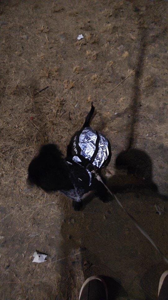 背中のラインとロゴが反射素材になっていて、車のライトや街灯にピカッと光ります。夜や早朝のお散歩に安心です。
