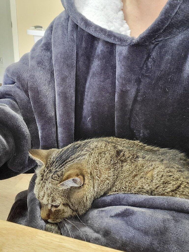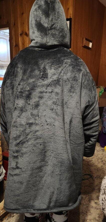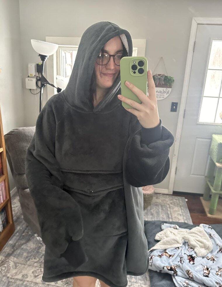 だいぶゆったり&長めのシルエットで、とにかくふわふわ。「袖とフードがついたお気に入りの毛布」を着てる感じです。