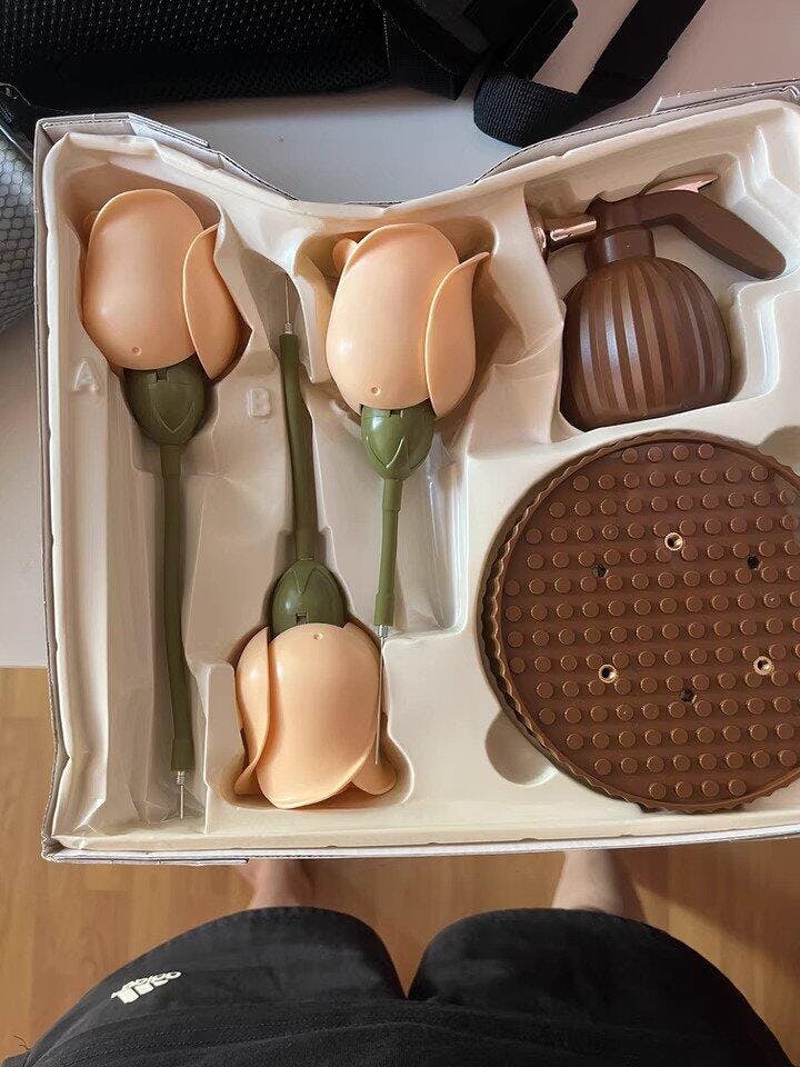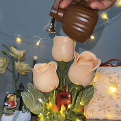 ちいさなジョウロのリモコンを押すだけで、花びらがふわっと広がって優しい光がふんわり灯る。お部屋の雰囲気が一瞬で変わる。