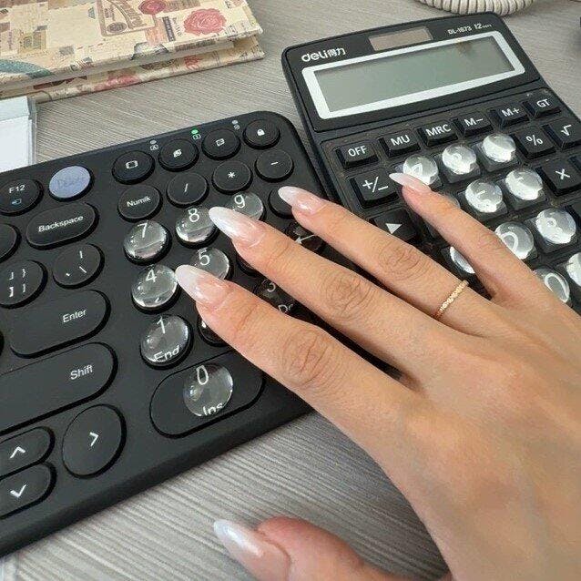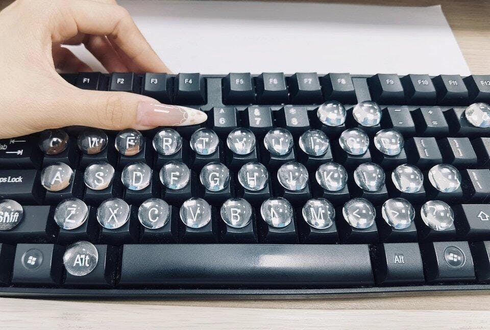 高さのあるドームで上からタップ。キーのすき間に挟まらず、ストーンや先端の欠け・浮きをガード。