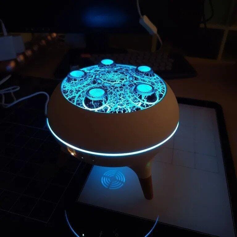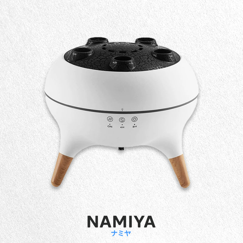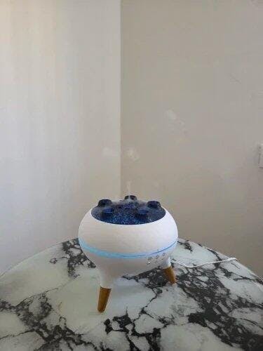 木製の三脚スタンドと、丸みのあるミニマルデザイン。クラゲミストはベッドサイドからワークスペースまで自然に馴染む。