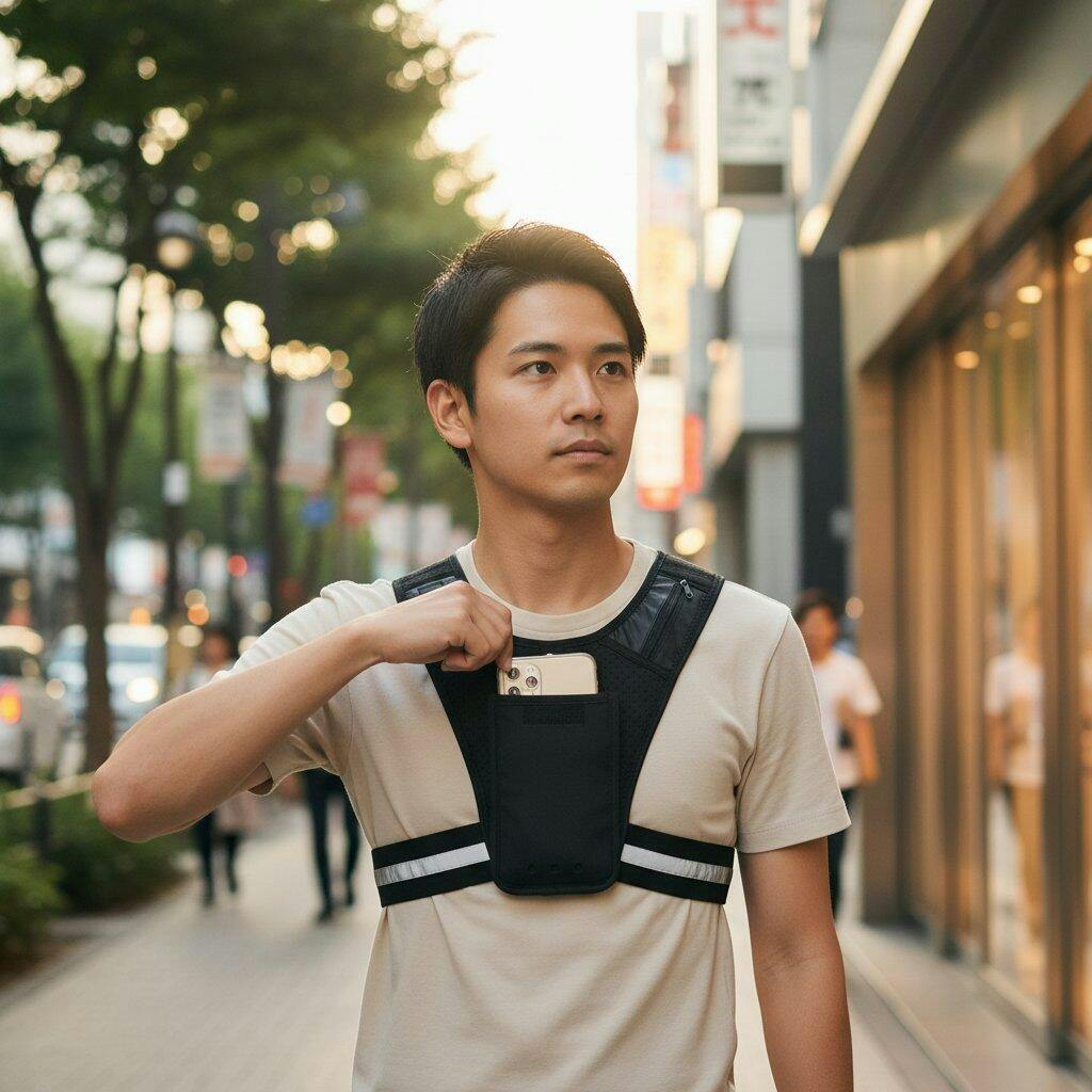 いいえ。伸縮ストラップが体に密着し、揺れを防ぎます。