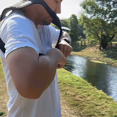 伸縮ベルトとワンタッチバックルで体にぴたっとフィット。走っても登っても、ズレ知らず。